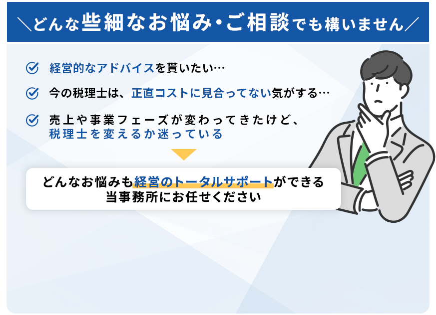 当事務所では、サービス業・小売業・建設業・製造業・IT・医療・不動産など、さまざまな業種のお客様に対応しております。個人事業主の方から法人まで幅広く支援しておりますので、業種に関係なくご相談いただけます。